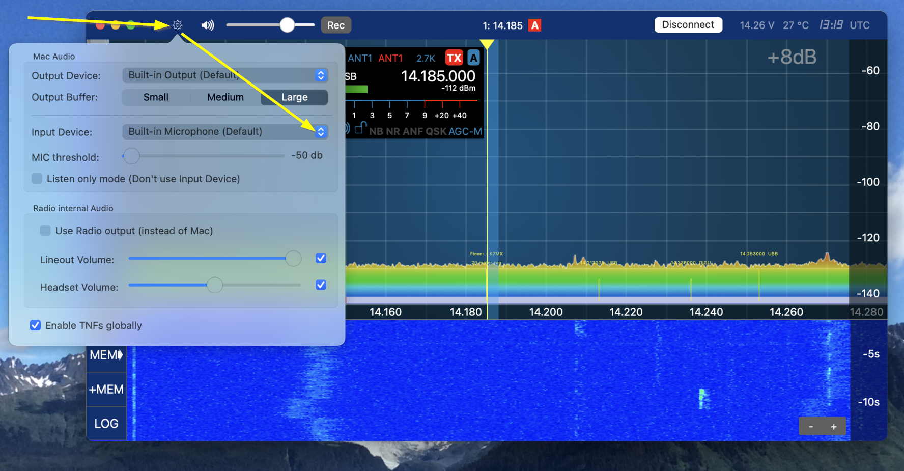 - In SmartSDR for Mac, select the Mac's Mic Input clicking on the "Gear" Icon at the top of the main SmartSDR Screen.