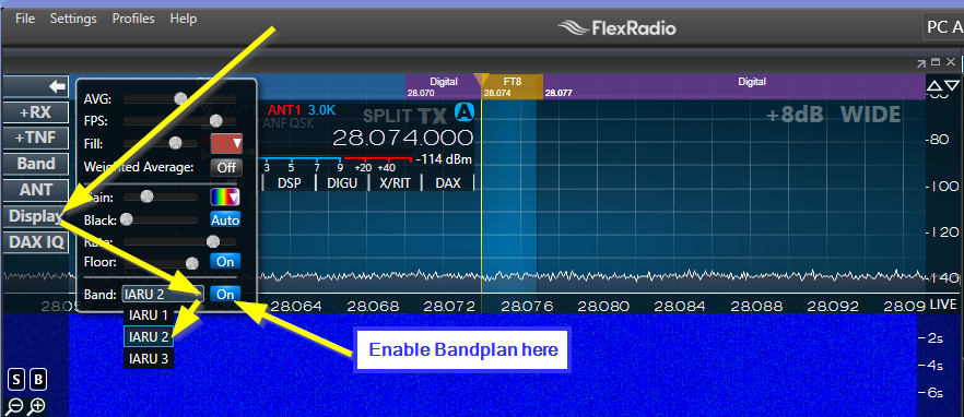 Once enabled, the feature will display the recommended bandplan on each panadapter, regardless of which receive antenna is selected.