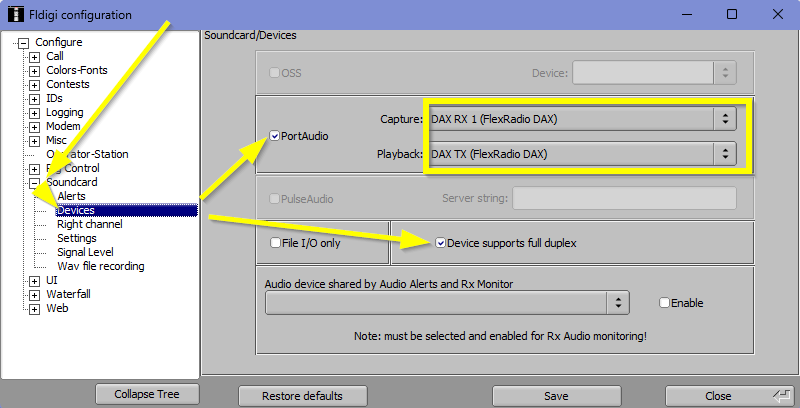 4) Configure the Fldigi "Sound Card" settings.