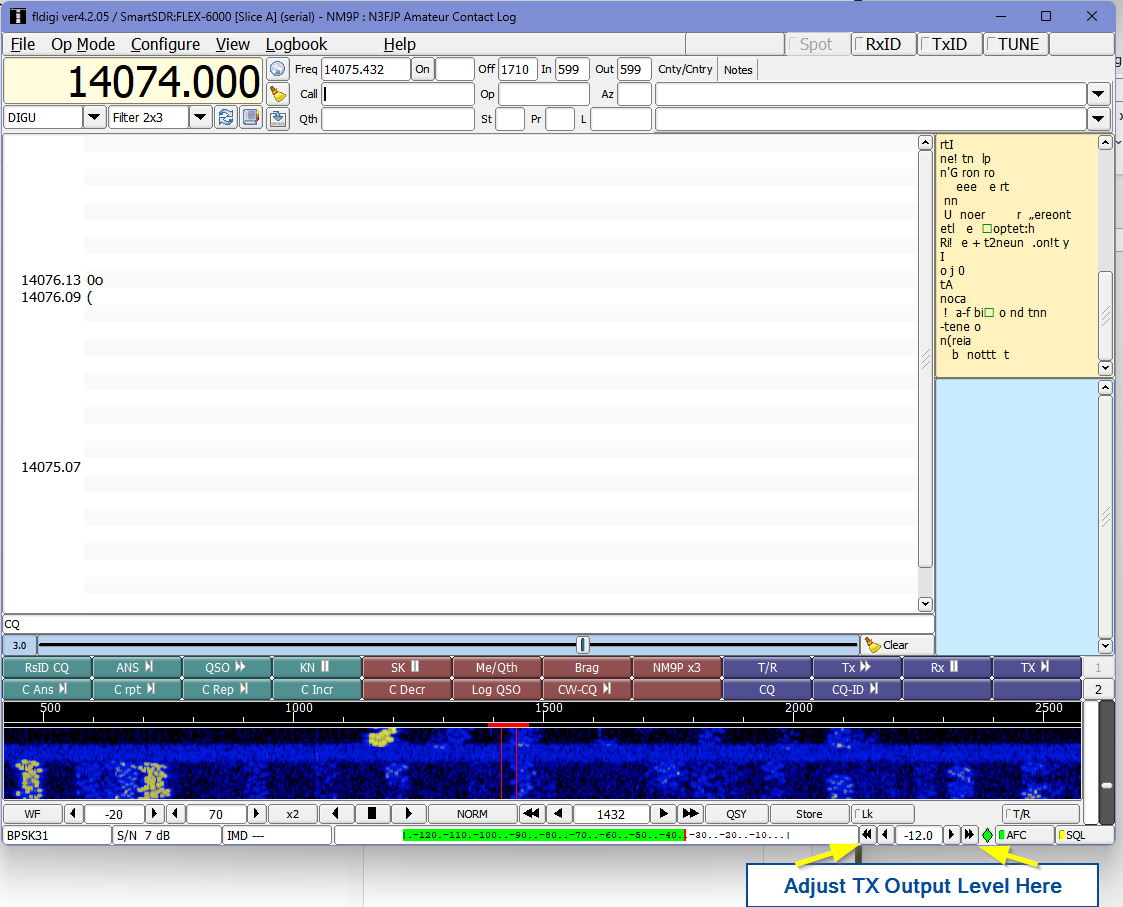 - Once you begin a transmission with Fldigi, you will need to fine-tune the Transmit Audio using the left and right arrow keys at the bottom right of the Fldigi screen. There are large and fine adjustment buttons. The Double-arrow buttons adjust in whole dB steps. The single-arrow buttons adjust in tenths of a dB steps.